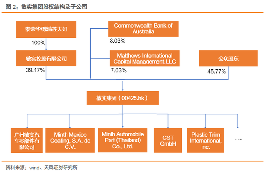 股权架构稳定,子公司遍布全球。集团创始人秦荣华1997年3月创办敏实集团,为公司控股股东,于2005年7月获委任为敏实集团有限公司董事。现任敏实集团有限公司董事会主席、行政总裁兼执行董事。截至2019年6月,秦先生通过敏实控股有限公司(全资拥有)持有敏实集团4.5亿股份,占敏实集团已发行股本的39.17%。拥有71家子公司,遍及中国、美国、泰国、墨西哥、德国。
