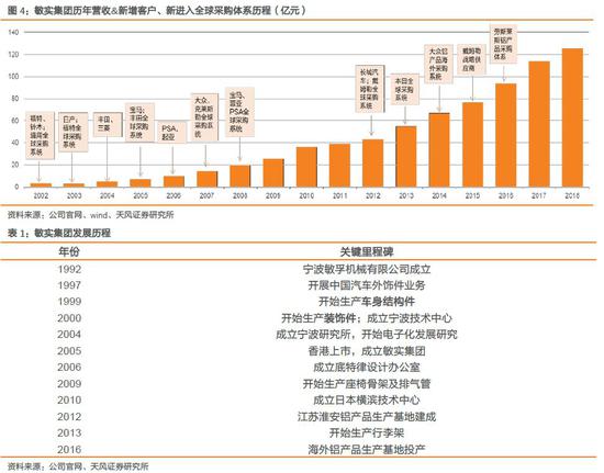 深耕汽车零部件领域28年,形成客户全品牌覆盖。1992年,宁波敏孚机械有限公司成立。发展初期,敏实与日系零部件供应商(东海、片山)结盟,依靠本田、日产等日系客户发展起来,并逐步拓展客户面,最终覆盖了欧美日中韩所有主流品牌,打入通用、日产、本田、丰田、宝马、戴勒姆、大众等品牌的全球供应体系。