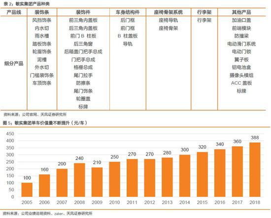 公司持续研发新产品,品类日趋丰富,单车价值量逐年提升,从2005年的100元上升至2018年的388元。敏实顺应轻量化,积极布局铝产品,品类单车价值量大幅提升,如电池壳单价在2000-5000元。电池壳加速放量,单车价值有望再跨台阶。