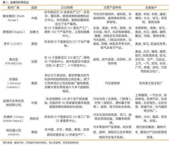 推行全球化战略。积极拓展国内外各品牌客户,通过进入众多跨国汽车企业全球采购系统,以实现业务稳健增长。如佛吉亚、安通林、李尔、麦格纳这些内外饰巨头均参与全球车企配套,并且各巨头均在全球范围内设立生产基地和研发中心。