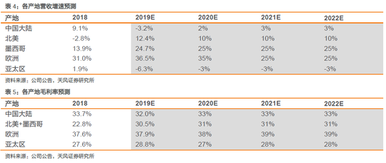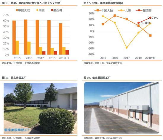 北美地区营收恢复。 2019年上半年,中国、亚太地区营收增速出现负增长,分别为-7.74%、-7.88%,欧洲地区营收持续高增长,同比增长35.81%,北美地区营收增速从18年-2.79%回升至12.86%,墨西哥营收加速增长,增速提至22.74%。各交货地区毛利率相对稳定,北美地区毛利率有明显提升,从18年22.76%增加至19H1的29.99%。