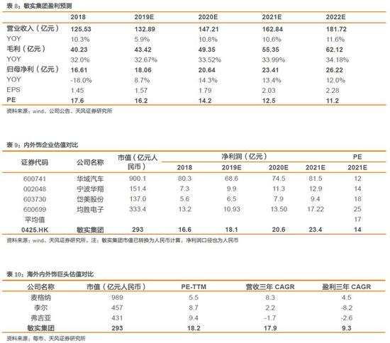 我们预计公司19-22年营收分别为133、147、163、182亿元,归母净利润分别为18、20.6、23.4、26.2亿元,对应PE分别为16x、14、13x、11x。由于港股没有同业务公司,我们选取A股和海外的内外饰企业进行估值对比。A股可比公司行业平均估值为17x,海外内外饰巨头平均PE-TTM为8x,但其复合增速远低于敏实。考虑到公司电池壳业绩规模打开后,收入占比有望达到30%,公司估值体系有望重塑,给予公司21年15倍PE,对应目标价30元人民币(对应港币34元),首次覆盖,给予公司“增持”评级。