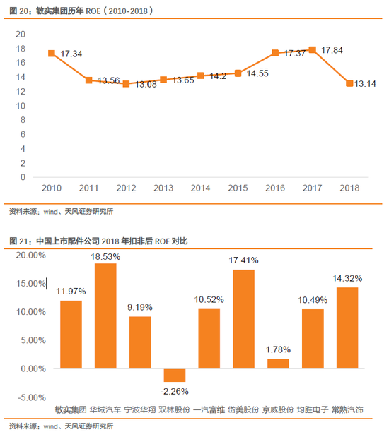 敏实集团经营长期稳健,盈利能力有望恢复。公司ROE逐年提高,2017年ROE高达17.8%。2018年受中美贸易争端影响, 公司业务出现较大波动,ROE下滑至13%,但在同业中仍处于较高水平。随着贸易争端缓和、公司出口美国业务占比降低,未来公司盈利能力有望迅速恢复。