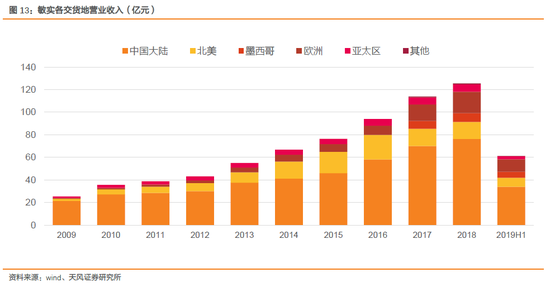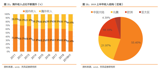 海外收入占比不断提升。 2011年,公司海外市场收入占比仅为26.5%,2018年这一比例提升至39.1%,2019年上半年突破40%。北美、欧洲作为公司着力发展的两个重要海外市场,2011年占比仅为14%、5%,2019年上半年,北美和欧洲市场的比重提升至21.97%、18.19%。