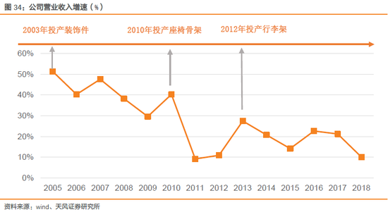 新产品一经推出,可迅速提升销售收入。 2003年以来公司陆续推出三大产品装饰件、座椅骨架、行李架,新产品推出两年以内便可以明显提升销售增速。我们预计公司目前推出的铝电池盒、摄像头模组以及 ACC 盖板、标牌等新产品,将在近两年迅速放量,复制过往的成功路径。