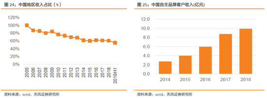 客户结构多元化,开拓自主品牌高端客户。自2005年以来,随着公司全球化战略推进,国内外业务齐头并进,国内业务占比逐年降低,2019年上半年,已从05年100%降至55.45%。国内业务是主要是日产、本田、丰田等销量稳健的日系品牌,并于近几年积极拓展优质自主品牌客户,对接长城、上汽、吉利、广汽等客户订单,自主品牌客户收入高速增长。