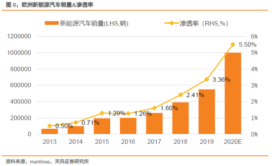 欧洲新能源渗透率迅速增长。欧洲新能源补贴、税收政策、碳排放法规政策共同推动了新能源市场的高增长。自2015年汽车碳排放目标值完成后,欧洲新一轮碳排放政策将于2020年实施,要求95% 销售的新车型平均碳排放降低 95g/km,否则受到欧盟每辆车95欧元/克/公里的罚金处罚,2021 年该标准要求落实到全部新车型,碳排放政策实施将进一步带动欧洲电动车产销量高增长。2017年至2019年,欧洲新能源汽车销量分别为26万、39万、55万辆,增速分别为30%,50%,40%,19年欧洲新能源汽车渗透率达到3.36%。我们预计2020年欧洲新能源销量或超100万辆,实现翻倍增长