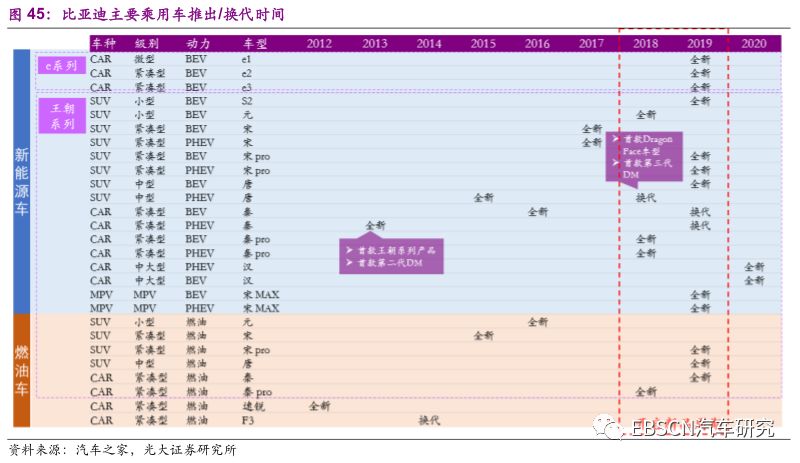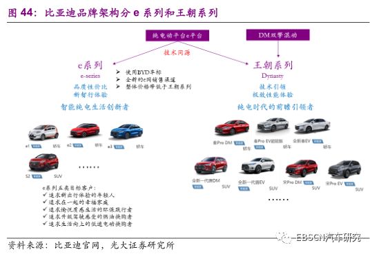 2019年3月份公司对旗下产品进行梳理,正式发布e系列及产品规划。比亚迪e系列作为纯电动产品矩阵与王朝EV系列有所不同,e系列更加注重品质性价比、新智行体验。产品又分e和S,“e”字开头代表轿车、“S”开头代表SUV;王朝EV系列则更加注重技术引领、极致性能体验,二者相辅相成,形成合力,全面覆盖新能源汽车领域的不同用户群体。