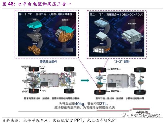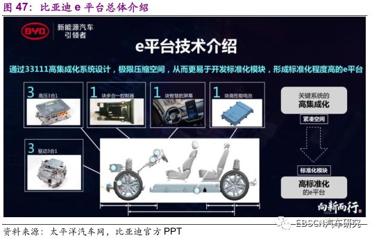 2019年发布的全新电动平台e平台是公司十年新能源汽车技术积累的结晶。e平台核心理念是“33111”,包括驱动电机三合一、高压控制器三合一、低压控制器多合一、一块动力电池和一块智能网联中控屏。比亚迪e平台是通过“33111”高度集成化设计来达到极限地压缩空间、从而更容易开发标准化模块的目的,最终形成标准化程度高的纯电动车平台。