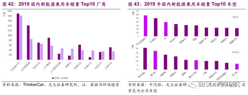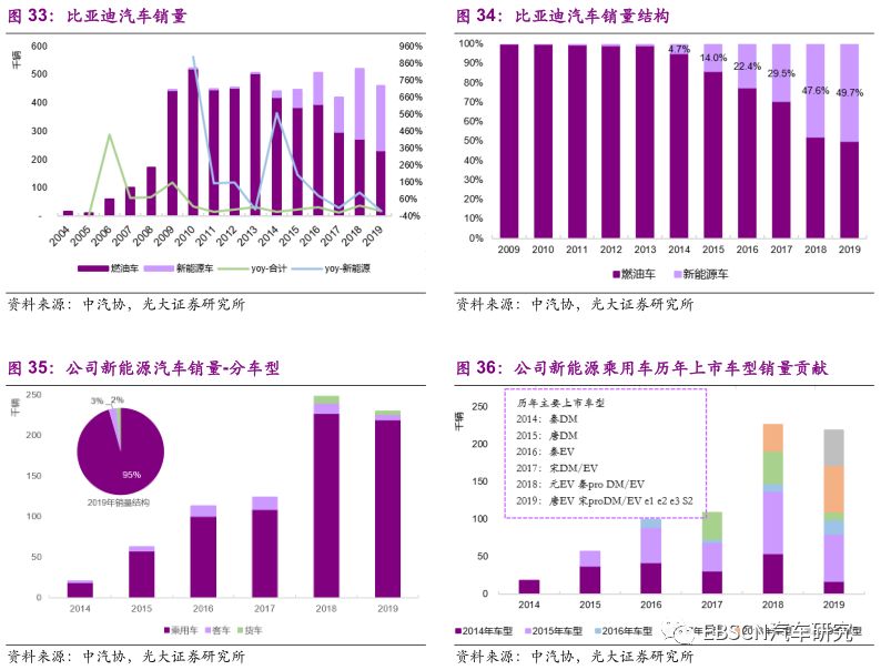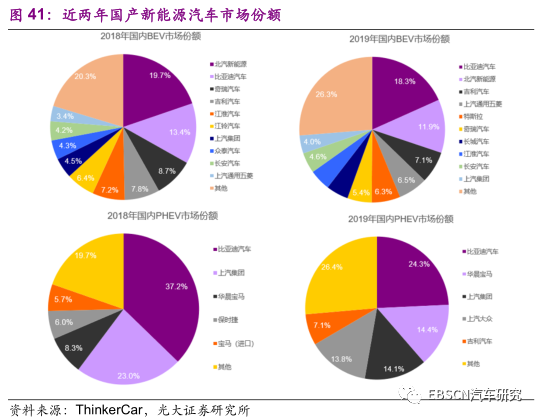 截至2019年,公司一直保持国内新能源乘用车销量第一。2018年/2019年公司国内新能源乘用车市场份额均为20%。其中,2019年纯电车型市场份额18.3%,超过北汽新能源,占据第一;公司插电混动市场份额保持第一,19年份额为24.3%,受竞品车型的增多,市场份额同比-13pct。19年公司e5和元EV销量跻身国内纯电乘用车TOP3,唐DM、秦pro DM和宋DM跻身国内插电混动乘用车TOP10。