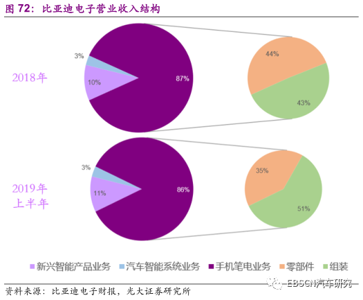 比亚迪电子营收主要来源于手机笔电零部件和组装业务,汽车智能和新型智能产品正当起步。2018年,手机笔电业务占营收87%,其中,组装业务占整体的43%,零部件业务占整体的44%。新型智能产品业务占10%,汽车智能业务占3%。