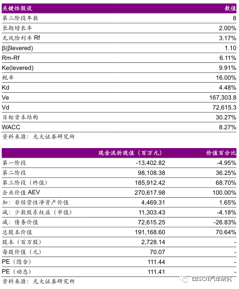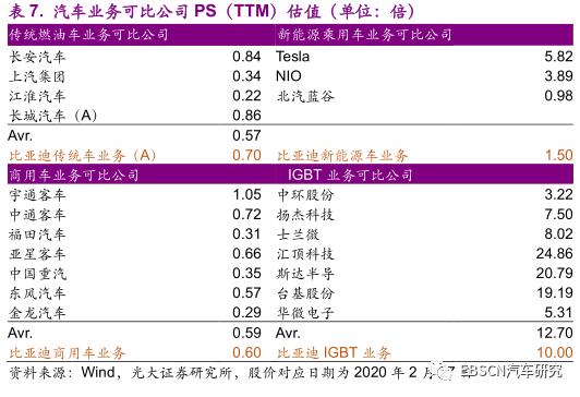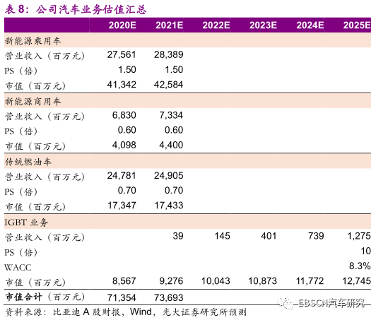 对于IGBT业务,我们预计2025年销售规模达到12.7亿元。根据可比公司PS均值,给予IGBT业务10x的PS估值,对应127亿元市值。按公司8.3%的WACC进行贴现,对应2020年86亿元市值。综合整车业务与IGBT业务,公司汽车业务2020年估值714亿元。