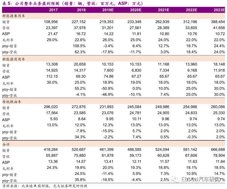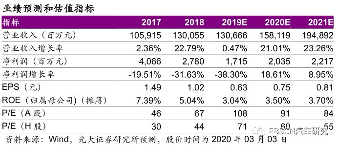 2019年下半年公司推出多款全新/换代车型,2020年有望受益此轮新品产生的增量。但考虑到公共卫生事件对购车活动的影响,2020年销量增速或较弱。未来随着整体新能源汽车渗透率的提升,公司新能源车型销量规模有望同步提升。我们预测公司2020~2023年汽车销量同比增速为+5.9% / +7.3% / +10.9% / +14.7%。