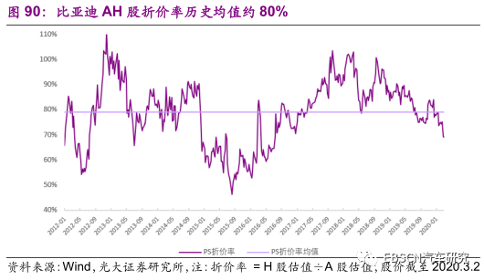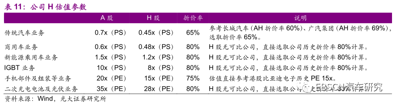对于传统汽车业务,港股市场存在可比公司长城汽车和广汽集团。我们参考两家公司AH折价率,最终按65%折价率给予公司港股PS为0.45x。对于手机部件及组装等业务,直接参考比亚迪电子(0285.HK)历史PE均值,给予15x的PE估值。对于其他业务,因缺少港股的可比公司,我们统一按公司AH历史折价率均值80%计算港股对应的估值。