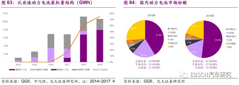 2017年2月上市的唐DM、秦DM率先从磷酸铁锂切换为三元锂电池,4月全新推出的宋DM直接使用三元锂电池。随后,2018年秦EV、e5、宋EV开始切换三元锂电池。截至2019年,比亚迪乘用车中除e6使用磷酸铁锂电池外,其他车型均使用三元锂电池;客车均使用磷酸铁锂电池,货车约5%使用三元锂电池。