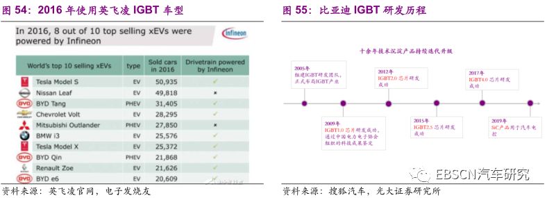 全球新能源汽车IGBT竞争格局较为集中,主要厂商有英飞凌、三菱电机、电装等。据英飞凌数据,2016年全球每10辆新能源汽车就有8辆使用英飞凌IGBT产品,比亚迪唐DM、秦DM和e6等车型部分使用英飞凌IGBT模块。