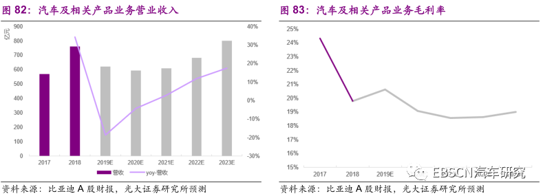 综合整车销售和IGBT业务,预测公司汽车业务2019~2023年营业收入为619 / 592 / 607 / 678 / 793亿元。受新能源汽车购置补贴退坡影响,20~21年公司汽车业务毛利率或有所下行。之后,随着成本较低的“刀片电池”普及,毛利率有望企稳并小幅回升。预测2019~2023年汽车及相关产品业务毛利率为20.6% / 19.5% / 18.5% / 18.6% / 19.0%。