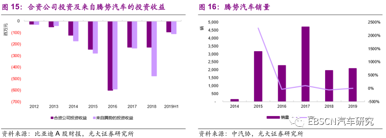 合资公司投资收益:亏损主要来自与戴姆勒的合资公司腾势汽车。18年合营/联营企业产生的投资收益为-2.2亿元,同比-0.1%。相比于18年公司44亿元的利润总额,合资公司产生的亏损占比较小。公司主要合资企业是比亚迪汽车工业与戴姆勒共同出资成立的深圳腾势新能源汽车有限公司(下面简称腾势汽车),双方各持股50%。由于销量欠佳,目前腾势汽车持续处于亏损状态。