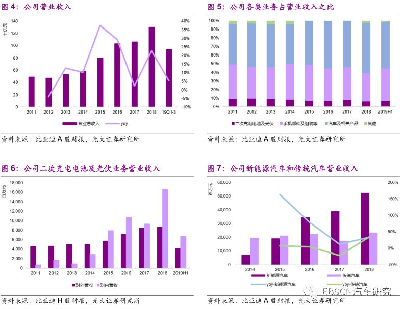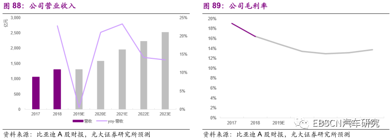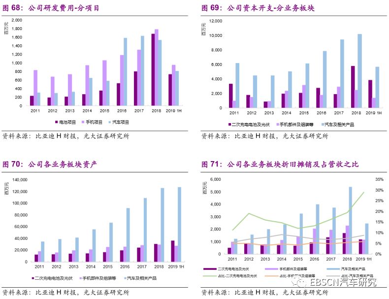 电池业务费用支出内部摊销致公司利润承压。作为公司新能源战略发展方向的载体,公司在电池业务投入不低。2018年电池项目研发费用超过汽车项目,资本开支和资产规模超过手机业务。不过目前电池业务以内供为主,2018年对外营收规模仅约45亿元,折旧摊销占营业收入约20%,远高于汽车业务的7.5%和手机业务的5.6%。目前电池业务的各类费用支出仅依赖整车销售摊销,拉低公司净利润率。电池业务独立、增加外供规模能扩大公司营业收入,有效摊销前期各类投入,改善公司整体盈利水平。