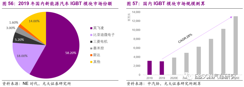 2019年国内新能源汽车IGBT份额前三为英飞凌(58%)、比亚迪(18%)和三菱电机(5%)。受限于国内IGBT供应商稀缺,市场大半份额被外资企业占据,市场集中度过高。2019年公司IGBT芯片晶圆的产能达到5万片/月,对应可配套新能源汽车60万辆。