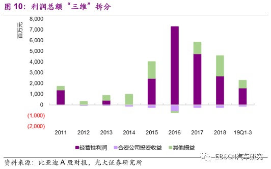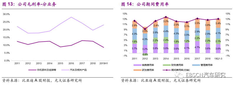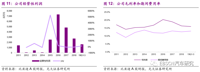 经营性利润:2016年后新能源汽车补贴退坡,汽车业务毛利率下滑,致经营性利润下行。2016年~2018年,汽车业务毛利率分别为28.2%、24.3%和19.8%,呈下行趋势;手机业务毛利率分别为10.0%、13.1%和12.6%,小幅上行。整体期间费用率相对稳定,17~18年维持在13%左右。