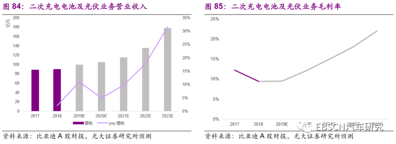 综合消费电子电池和光伏业务,我们预计二次充电电池及光伏业务2019~2023年营业收入为99 / 104 / 114 / 135 / 177亿元。