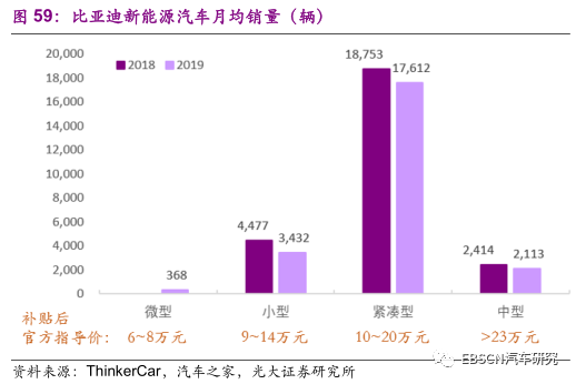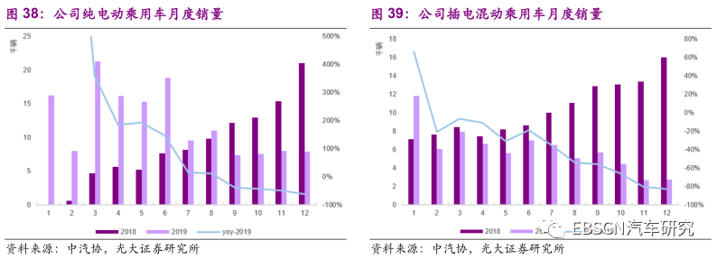 补贴退坡,2019年下半年销量承压。2019年3月,2019年新能源汽车补贴政策出台,3月26日~6月25日过渡期补贴退坡40%(技术条件满足19年要求),过渡期之后补贴金额约退坡75%,退坡力度空前。受补贴退坡影响,19年7月起公司新能源汽车销量同比持续下滑,拖累全年销量。2019年公司新能源汽车销量约23万辆,同比-7.4%。其中,19H1销量14.6万辆,同比+94.5%,19H2销量8.4万辆,同比-51.5%。受益于18H2上市的元EV和19H1上市的唐EV,19H1纯电车型销量同比显著增长。因新品供给增加, 19H2纯电车型销量下滑幅度低于插电混动车型。