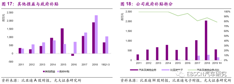 其他损益:近两年,以政府补贴为主的其他损益占利润总额的比例持续提高。2018年其他损益为19亿元,同比+79.3%,占利润总额比例为43.4%。其他损益主要来源是政府补贴(不含新能源汽车购置补贴)。2018年公司获得政府补贴23.3亿元,同比+82.9%,占净利润的66%。政府补贴中80%以上来自汽车和电池相关业务板块。