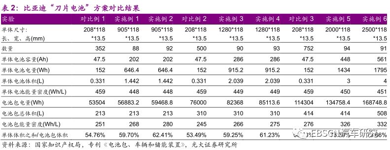 在比亚迪公布的专利中,对“刀片电池”成组的效率与传统电池方案进行了对比。“刀片电池”的电池包体积能量密度比传统方案提升10%~20%,意为整车装载电池量提升,续航里程提升。“刀片电池”体积能量密度的提升不仅来自电芯的尺寸和 pack 的优化,更有电芯及内部的设计、生产工艺甚至材料配方的优化升级。