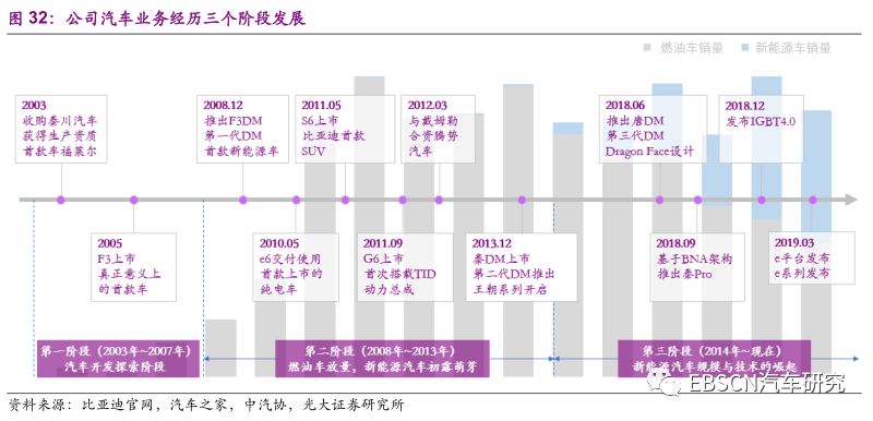 2003年公司收购秦川汽车,正式进军汽车行业。经历十多年的发展,公司先后自主研发掌握燃油发动机、双离合变速器等传统动力总成技术,新能源汽车“三电”核心技术以及智能网联技术。我们把公司汽车业务的发展历程划分为三个阶段: