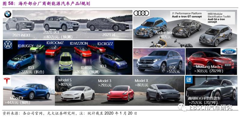 目前外资/合资全新新能源车型的价格主要位于20万元以上。2020年作为新能源汽车全球化的新起点,全球各大厂商纷纷推出全新的、非“油改电”的主力车型。由于作为厂商进军新能源汽车市场的里程碑,这类主力车型定位通常集合厂商汽车电动化、网联化技术,产品新能突出,市场定位较高。