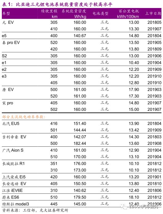 公司三元锂电池技术处于头部水平。公司动力电池虽然是磷酸铁锂起家,但在三元锂电技术上也达到较高水平。2018年公司上市新车的动力电池系统能力密度基本为160Wh/kg,超过特斯拉国产Model 3、北汽EU5等主流车型,达到行业头部水平。
