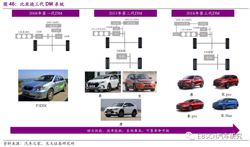 第一代DM系统(2008年~2013年):开启公司进军新能源汽车之路。公司自2003年开始研发DM双模混动技术,2008年首款DM车型F3DM上市销售。第一代DM双模系统采用发动机+双电机动力搭配形式,不需要变速箱,使用磷酸铁锂电池,车辆可在纯电动(EV)和混合动力(HEV)两种模式切换。F3DM纯电动模式续航里程达到100公里。并且突破反复充电、家用插座充电技术难关。