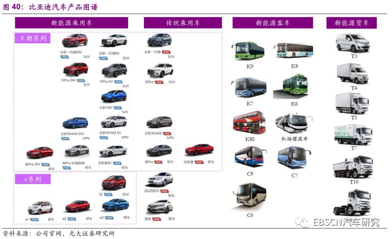 打造最全产品线,销量雄冠行业。公司新能源汽车产品覆盖乘用车、客车和货车。凭借传统动力总成和“三电”技术的自主研发储备,公司新能源技术实现插电混动和纯电动双轨并举。从车型上看,公司产品级别从微型到中型,产品类型从轿车到MPV,可谓全方位覆盖。