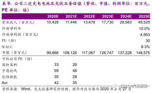 随着动力电池外供,公司电池业务营业收入将快速增长。我们预测2025年公司二次充电电池及光伏业务营业收入为495亿元。参考可比公司宁德时代(18A:12.6%)和国轩高科(18A:11.4%)的毛利率,并考虑到未来行业竞争+OEM降本压力或致行业净利率下行,公司归母净利率或为10%,对应归母净利润约50亿元。2020年可比公司平均PE为42x。目前可比公司估值包含对未来业绩的预期,相对较高。2025年PE估值应有所降低,我们给予30x的PE估值,并按8.3%的WACC进行贴现,对应2020年999亿元市值。