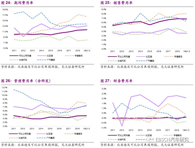 虽然在A股财报框架下中无法准确拆分出汽车业务的期间费用,但由上述港股财报拆分的结论可知公司期间费用率主要由汽车及其他业务贡献,因此我们直接使用公司A股财报的总期间费用率与六家整车可比公司比较。