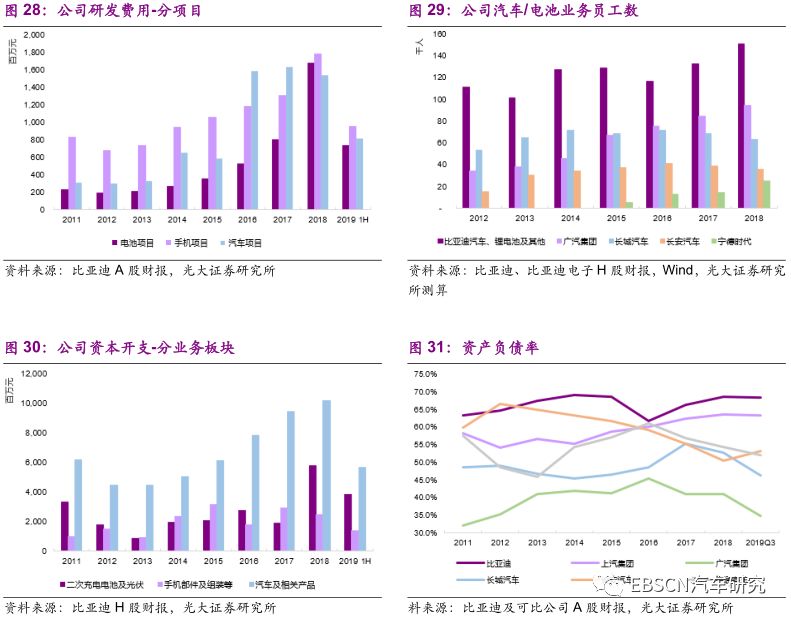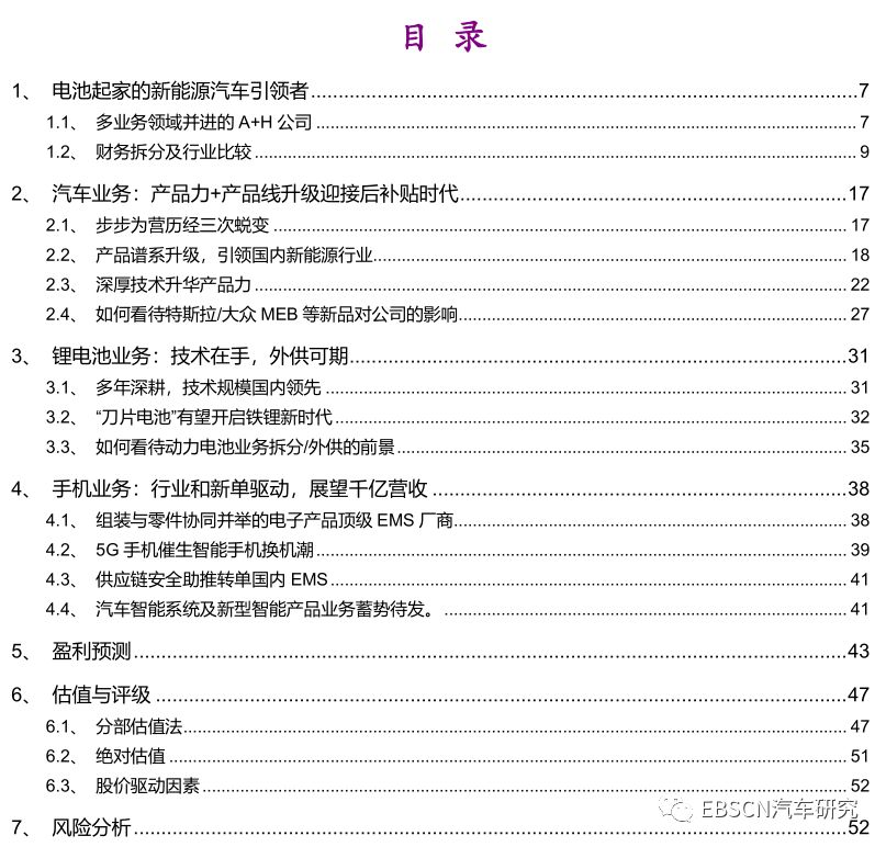 1. 我们充分利用公司A股、港股和子公司比亚迪电子的财报,尝试对公司汽车、手机等业务进行财务拆分。并将拆分后的汽车业务与可比公司进行比较,提炼出公司汽车高毛利率但低净利率的因素。