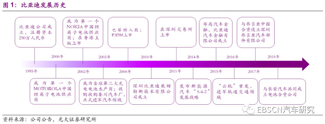 追逐科技创新趋势二十余年载。1995年,公司于深圳注册成立,从镍镉电池起家,后拓展至锂离子电池领域,成为MOTOROLA、NOKIA的锂电池供应商。凭借领先的技术以及成本优势,2003年公司迅速成为了全球第二大充电电池生产商。同年,公司通过收购秦川汽车厂正式进军汽车领域,2008 年推出第一款新能源汽车F3DM。2010年深圳比亚迪戴姆勒新技术有限公司成立,同年进军光伏市场。2016年“云轨”首发,轨道交通事业部成立。