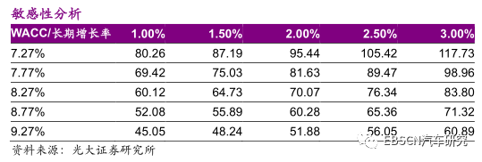 新能源汽车标的较少,我们选取美股特斯拉(TSLA.US)、蔚来汽车(NIO.US)和A股的北汽蓝谷作为可比公司。考虑特斯拉和蔚来汽车产品定位豪华市场,公司产品整体售价低于特斯拉和蔚来汽车,公司估值应有所折价。参考A股市场的北汽蓝谷,并考虑到公司更全的产品布局和更强的技术实力,我们给予公司新能源乘用车务业1.5x的PS估值。