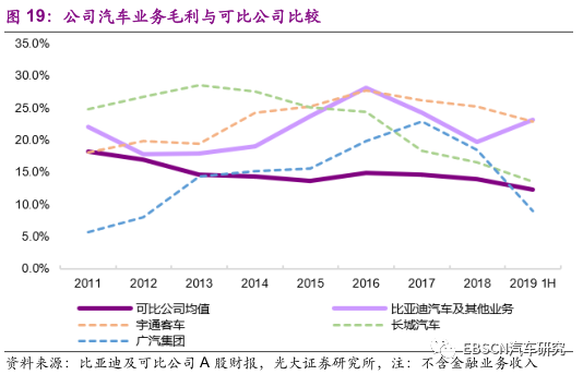 公司毛利率高于行业均值。因新能源汽车销量占比高于可比公司,且新能源汽车毛利率较高(含购置补贴),公司汽车业务毛利率高于可比公司均值。2016年公司汽车业务毛利率达到高点28.2%,均高于上述六家可比公司。此后毛利率虽下滑,但仍高于广汽集团、长城汽车等乘用车公司,仅低于客车龙头宇通客车。