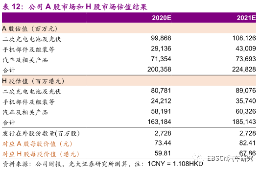 公司三块业务分属不同行业领域,采用分部估值法对公司进行估值。汽车业务使用PS估值,2020年估值714亿元;二次充电电池及光伏业务采用PE法按2025年归母净利润估值再贴现,2020年估999亿元;手机部件及组装业务采用PE估值,2020年估值291亿元。因此,2020年公司合计估值为2004亿元,对应每股价值73.44元。港股市场较A股市场有所折价,2020年公司估值1632亿港元,对应每股价值59.81港元。A股/H股均维持“增持”评级。