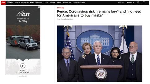 CNN报道称,彭斯4日下午在新闻发布会上说,美国公众感染新型冠状病毒的风险“仍然很低”,他同时还强调“美国人没有必要买口罩”。”
