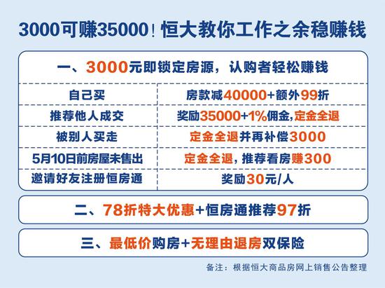 继2月抛出网上购房豪华“大礼包”后,3月4日,恒大“网上卖房”优惠再升级,这一次门槛更低,奖励更高:购房者只需要3000元就可以参与,如果推荐成交,至少赚35000元及1%佣金。就算不买房也没推荐购买成功,照样能保底赚10%,全民赚钱模式瞬间开启。