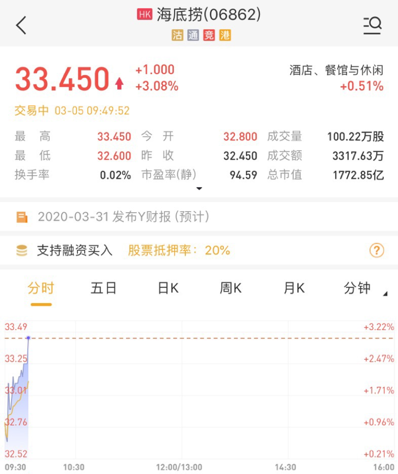 华盛资讯3月5日讯,海底捞(06862)盘中异动,一度涨幅超3%。截至发稿,海底捞涨3.08%,现报33.45港元每股,当前成交额3317.63万港元,总市值达1772.85亿港元,当前市盈率为94.59倍。此外,需要注意的是,3月3日海底捞曾遭高盛下调投资评级。