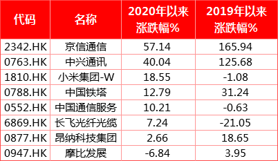 截至3月4日收市,在港股5G产业链板块中京信通信以2020年以来57%的涨幅暂时领先,而其后是中兴通讯涨幅也有40%,小米集团、中国铁塔以及中国通信服务涨幅都在10%以上。