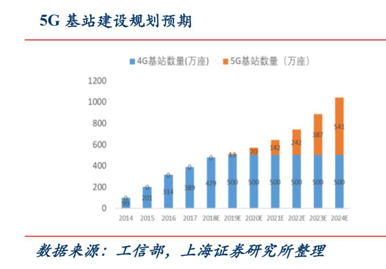 此前结合4G基站的建设周期,根据券商的保守测算,5G基站将会是4G基站的1.2倍,则国内5G基站约为540万,全球基站数按国内2倍测算,则全球5G基站数量将超过1000万个。