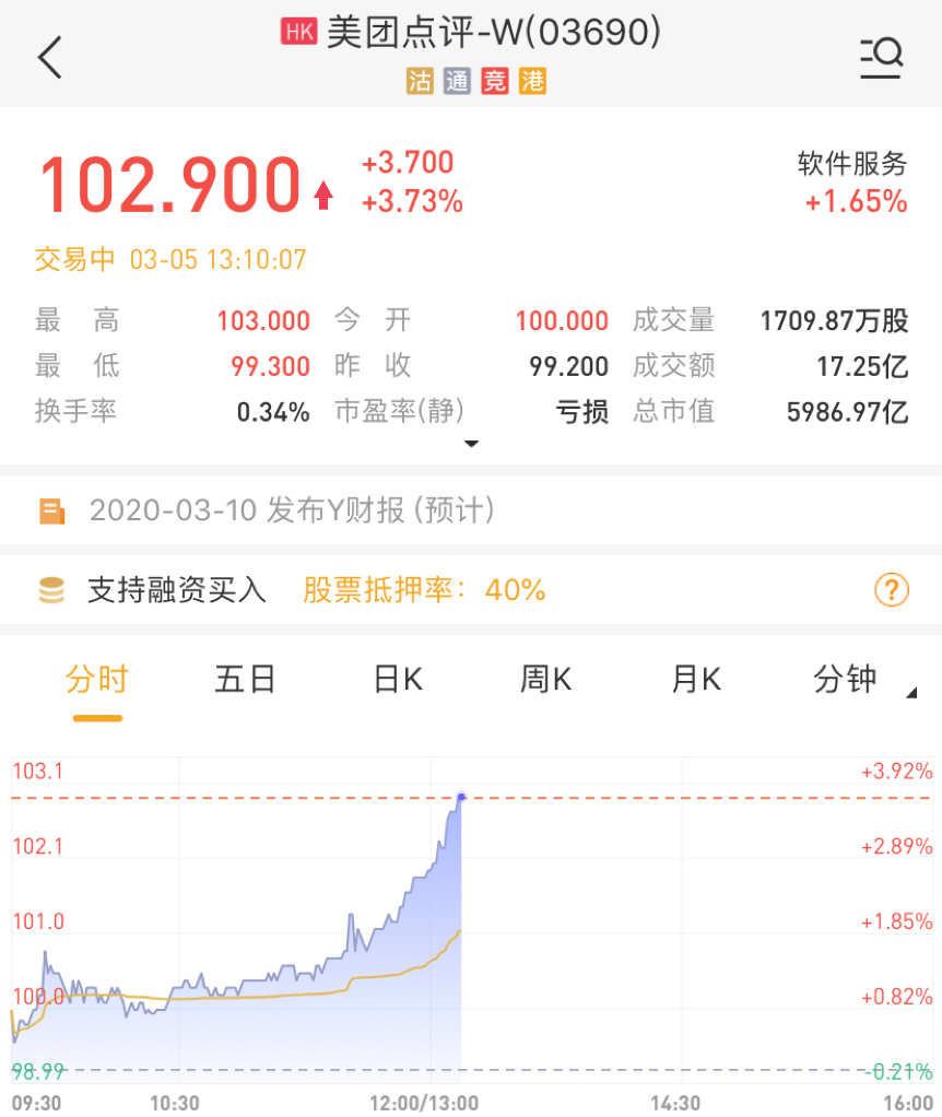 华盛资讯3月5日讯,美团点评-W(03690)午后走强,盘中一度涨近4%。截至发稿,美团点评盘中大涨3.73%,现报102.9港元,当前成交额17.25亿港元,总市值达5986.97亿港元。
