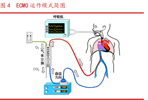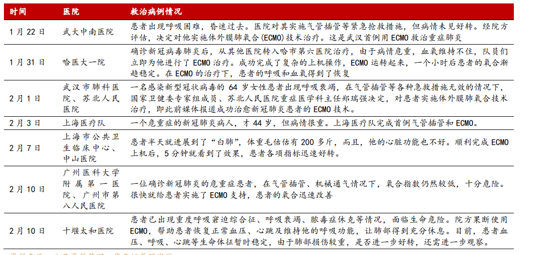 ECMO 是重症治疗方面的一种技术,对于受新冠病毒感染的重症患者,利用 ECMO设备可以暂时代替人的心和肺起作用,等待心肺功能恢复。自 1 月 22 日武汉大学中南医院首例用 ECMO 救治重症肺炎成功以来,据不完全统计,目前已有 6 家医院使用ECMO 技术将重症病人从死亡边缘拉回来。在多家医院使用 ECMO 技术取得成功的消息下,ECMO 俨然成为新冠肺炎重症患者的“救命稻草”。但在疫情面前,相关各方也正努力协调,支援湖北。根据目前的相关报道来看,山东、浙江的医疗队除了出动精锐支援湖北以外,还随行携带 ECMO 等关键设备。十堰市太和医院则通过全国资源调配,采购到了一台组装的 ECMO 设备。足见 ECMO 在一线重症治疗的重要性和紧迫性。