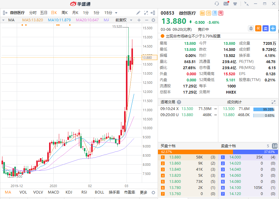 除了ECMO,微创医疗也布局众医疗器械多赛道,近期股价表现良好。自2月24日至3月5日收盘,数日内累涨逾50%。