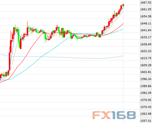 美市盘中,现货黄金涨幅扩大至2%,最高触及1668.71美元/盎司,较日低拉升近34美元;现货白银涨逾1%,最高触及17.409美元/盎司。